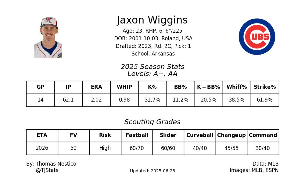 Jaxon Wiggins is an exciting arm with a plus-plus fastball and a strong arm. He has also taken big strides with his changeup this season, which has greatly improved his outlook as a starter. His biggest hole remains his command. He slashed his BB% this season, but he continues to run below average Strike% and falls behind in early often. His injury history has also limited his volume to just 122.0 IP since he was drafted in 2023. Any gains in the command department would go a long way for Wiggins’ stock.