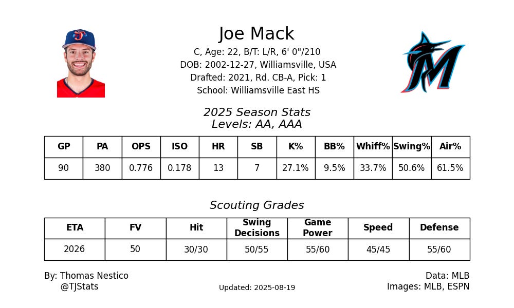 Joe Mack is a defensive wizard behind the dish, and his power upside makes him a dangerous threat at the plate. He was excluded from my Top 100 due to very worrisome contact rates and a staggeringly high K% in AAA. Without a more refined hit tool, Mack looks to be more of a defense-first/backup catcher than a Bonafide starter. The bat speed and swing buoy his offensive potential, and more contact would go a long way.