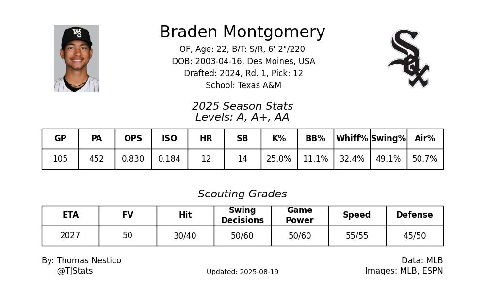 Braden Montgomery is a very tooled up prospect who was on the cusp of making my Top 100, yet concerns regarding his hit tool held him back. He has struggled making consistent contact against all pitch types this season and it only worsened following his promotion to AA. The rest of the profile makes him a shoe-in to being a Top 100 prospect very soon, but I need to see less swing and miss in his game before moving him up much higher.