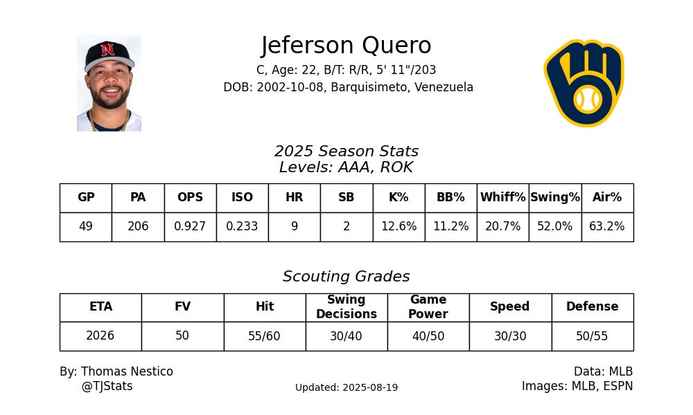 Jeferson Quero has slid down prospect lists due to injury concerns after he missed all but 1 PA in 2024. While this was a big factor into his slide down my rankings, the biggest culprit was his mediocre swing decisions and underwhelming power metrics. Quero is simply too aggressive; he chases a ton while not being extremely swing happy against pitches in the zone. While this hasn’t burned him in MiLB, this approach is typically heavily exploited in the Majors. On top of his poor approach, Quero is posting below average exit velocities. This is likely a function of his injury, and he would need to show that his power has returned before hopping back into the Top 100.