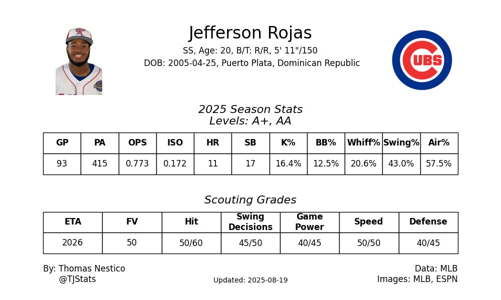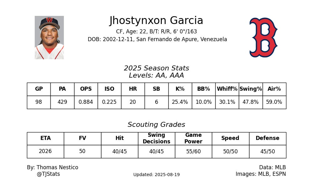 Jhostynxon Garcia, AKA “The Password”, quickly made a name for himself this season with strong results and exciting power production. His bat speed helps him stand out amongst his peers and he makes enough contact to punish pitches he connects on. He was a very close inclusion on my list, but he ultimately fell short due to concerns about his swing decisions. He sits below average in both O-Swing% and Z-Swing%, which could be exploited once he eventually faces MLB pitching. His hit tool likely settles in below average as well.