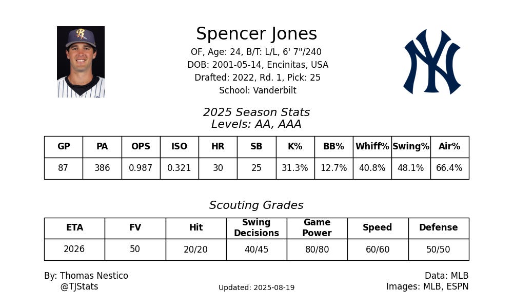 Spencer Jones is the most volatile prosect in baseball. He is rocking a Whiff% greater than 40% but he has also his 30 HR on the season. He is producing much better than last season, but he has showed no improvements in his contact rates. His power upside is ridiculous and he supports it with strong running and solid defense. He was left off the list because (1) He has the worst hit tool in the upper minors, and (2) He simply swings way too much. Any improvement in either of those categories would lighten up my perspective on Jones, but for now he is simply too risky to include on the Top 100.