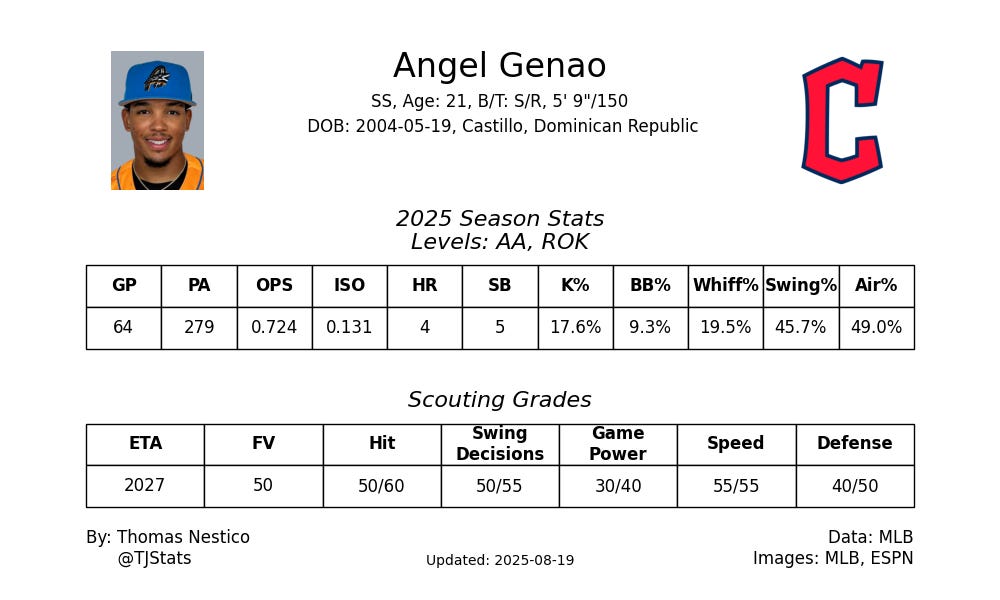 Angel Genao is the prospect which I differed the most from consensus. He has been graced with a Top 25 ranking by Fangraphs and sits comfortably in the Top 100 for other outlets. The driving factor for his exclusion on my list was his limited power potential. He is posting below average exit velocities while running a concerningly high GB%. These can both be explained by his lack of raw power and flatter swing plane. I don’t expect his power to develop much more given his smaller stature (EDIT: Genao is ~6’1” despite being listed at 5’9”. My apologies for not cross referencing. With that being said, I still have some concern with the power potential, but this makes that ease up a bit) and the rest of his tools do not supplement his profile enough to warrant a placement my Top 100.