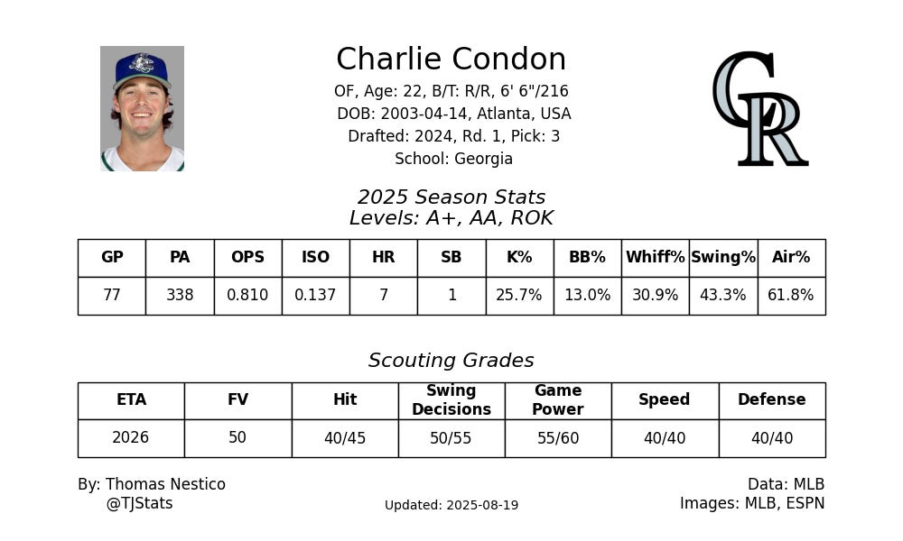 From an offensive perspective, Charlie Condon is a clear Top 100 prospect for me. His blend of eye and power make him a threat at the dish, and his improvements in his contact rates indicate he end up average in that department. He was left off my list due to poor speed and likely defensive home at 1B. I wouldn’t be surprised if he turned into a productive bat in the Majors, but the upside is limited given his one-dimensional profile.