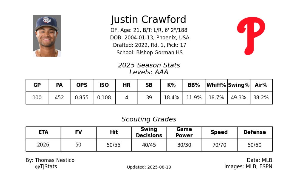 Justin Crawford was another tricky player to rank as his offensive profile is limited given his below average power and shaky eye, but the upside is very apparent when you consider his solid hit tool, elite speed, and strong defense in CF. He fell short of the list because of poor power metrics and an incredibly high GB%. There is an avenue to Crawford to be an effective MLB CF, but the upside feels limited given his offensive potential.