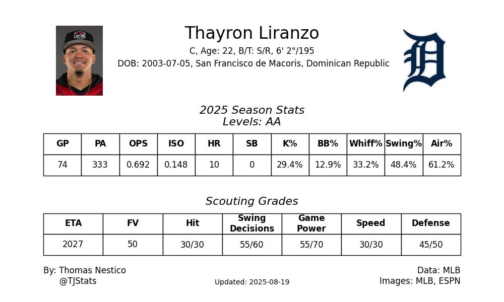Thayron Liranzo was a clear-cut Top 100 prospect for me this Spring. He looked like a future stud behind the plate for the Tigers and his power upside was tantalizing. While the latter remains true, he has struggled mightily with blocking and his hit tool dragged down his ranking to outside the Top 100. He still has elite power potential thanks to blistering bat speed and a lofty swing, but the concerns about the rest of his profile make him a very volatile prospect.