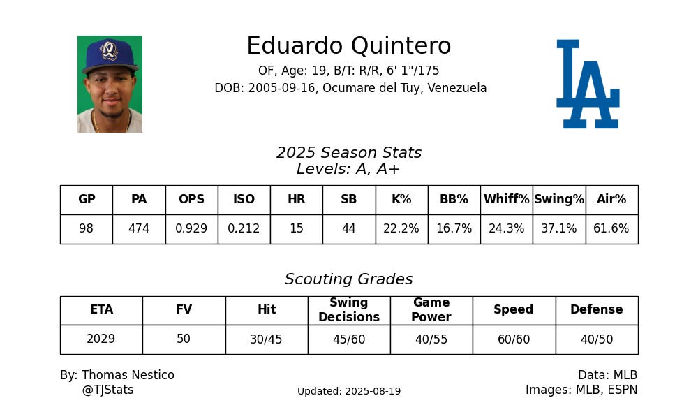 This is twice this week I've seen Quintero just outside a top 100. I am rooting for the kid to continue to climb. That LAD outfield pipeline looks incredible.