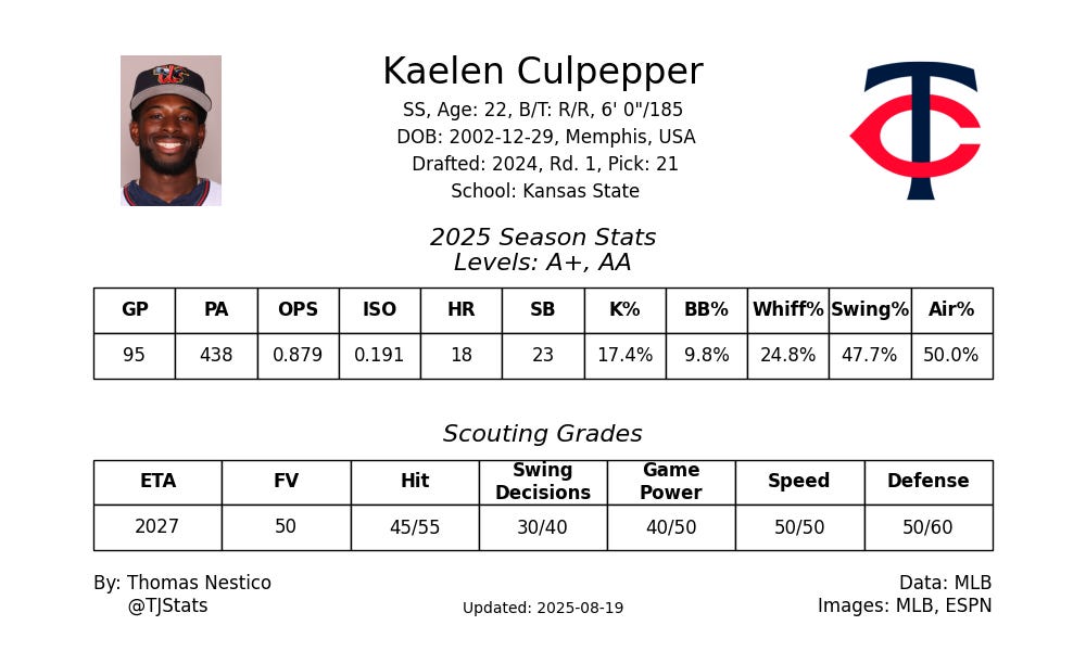 Kaelen Culpepper has been a hot name in the prospect world thanks to his stellar defense and now blossoming power. His exclusion was fuelled by atrocious swing decisions and a disbelief in his current slugging production. He struggles both with chase and lack of aggressiveness in the zone. His power metrics (i.e. 90th% EV, Barrel%) sit below average and do not paint him as anything more than an average power bat despite the home run explosion this season. His hit tool and glove keep him the conversation for being a Top 100 Prospect, but he needs to clean up his approach to make the leap onto the list.